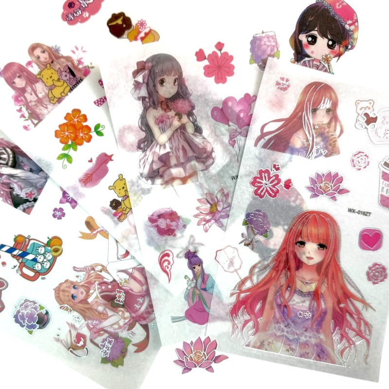 Zestaw dekoracyjnych naklejek inspirowanych japońskim stylem anime i kawaii. Delikatne, akwarelowe ilustracje dziewczyn, kwiatów i słodkich motywów tworzą spójną, pastelową kompozycję. Każda naklejka ma subtelne srebrne obramowanie, które dodaje im lekko błyszczącego, kolekcjonerskiego charakteru.