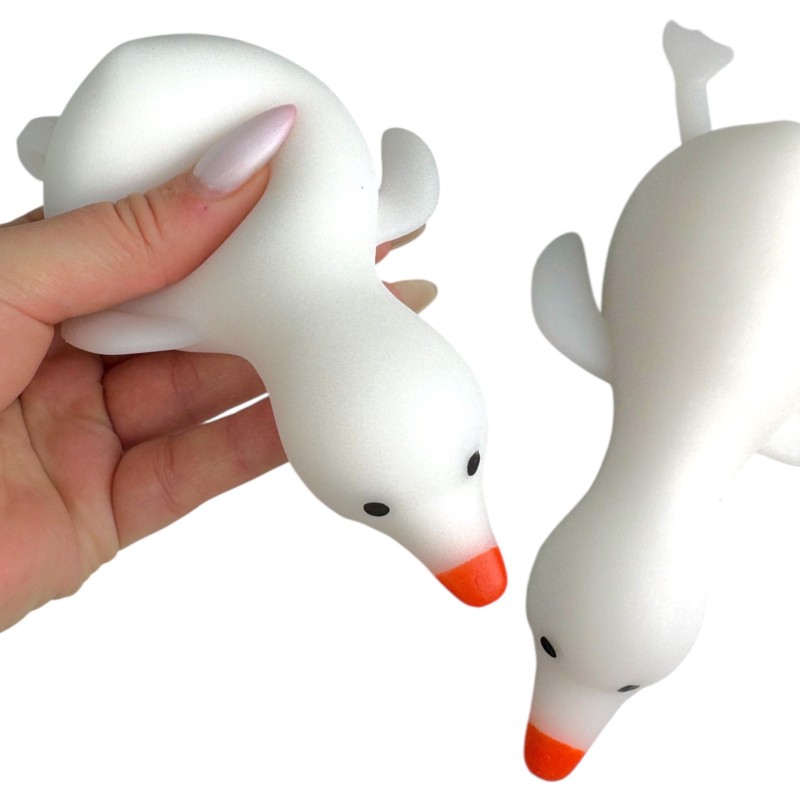 Mięciutki gniotek gąska z piankowym wypełnieniem. Idealny do ściskania, zgniatania i relaksu w tiktokowym stylu. Biały korpus, pomarańczowy dziób, uroczy minimalistyczny design.