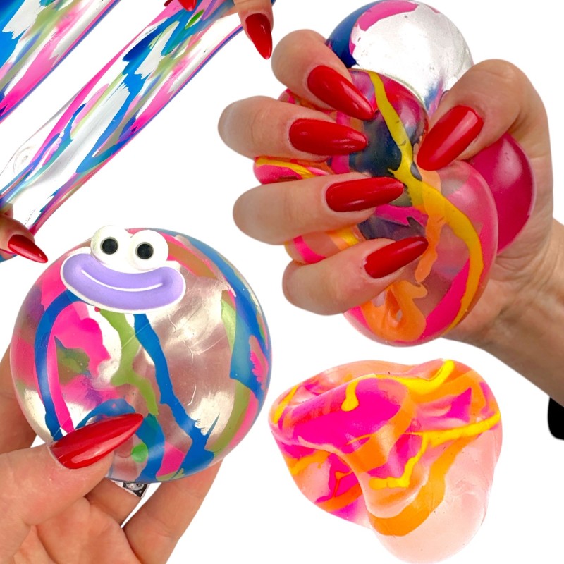 Przezroczysta kula wypełniona jest wielobarwnymi, intensywnymi smugami. Po zgnieceniu kolory mieszają się i tworzą nowe, hipnotyzujące wzory. Uśmiechnięta buźka dodaje całości funny charakteru i zachęca do zabawy.