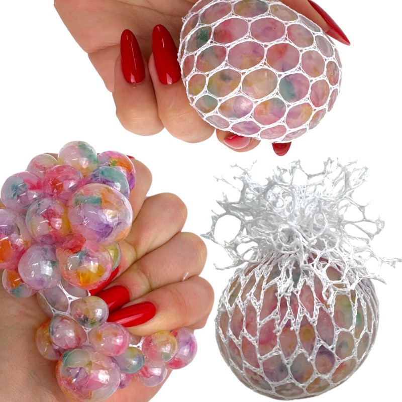 Kolorowa piłka sensoryczna wypełniona miękkimi kuleczkami orbeez, zamknięta w elastycznej białej siatce. Po ściśnięciu kulka zmienia kształt, a przez oczka siatki wychodzą dziesiątki małych bąbelków, które aż chce się dalej ugniatać.