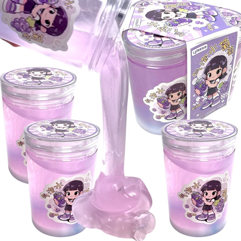 Zestaw trzech pachnących slime w stylu kawaii, zamkniętych w przezroczystych kubeczkach z uroczą grafiką dziewczynki z winogronami. Delikatnie fioletowo-różowa masa pięknie prezentuje się na biurku, półce lub wśród imprezowych gadżetów.