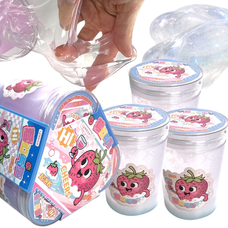Slime jest przejrzysty, lekko opalizujący, pięknie prezentuje się w świetle. Kolorowe etykiety z wesołą truskawką nadają całości słodki, kawaii charakter. Zestaw świetnie wygląda jako prezent, dodatek do paczki urodzinowej lub dekoracja stołu na imprezie dziecięcej.