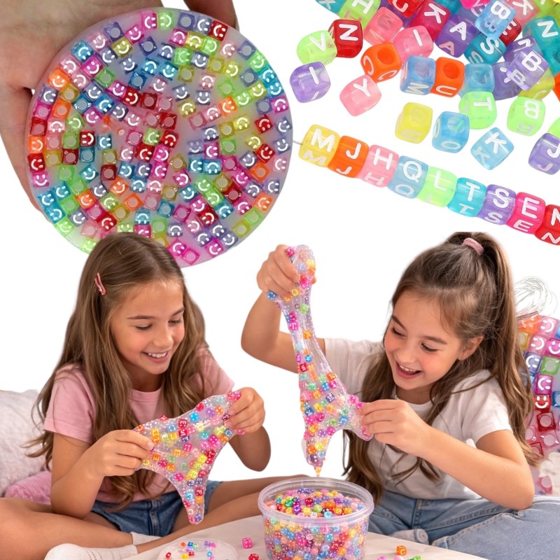 Przezroczysty slime z kolorowymi koralikami w kształcie literek, serc i emotek. Idealny gniotek sensoryczny i jednocześnie zestaw do tworzenia bransoletek przyjaźni. Zabawa w ugniatanie, rozciąganie i projektowanie własnej biżuterii.