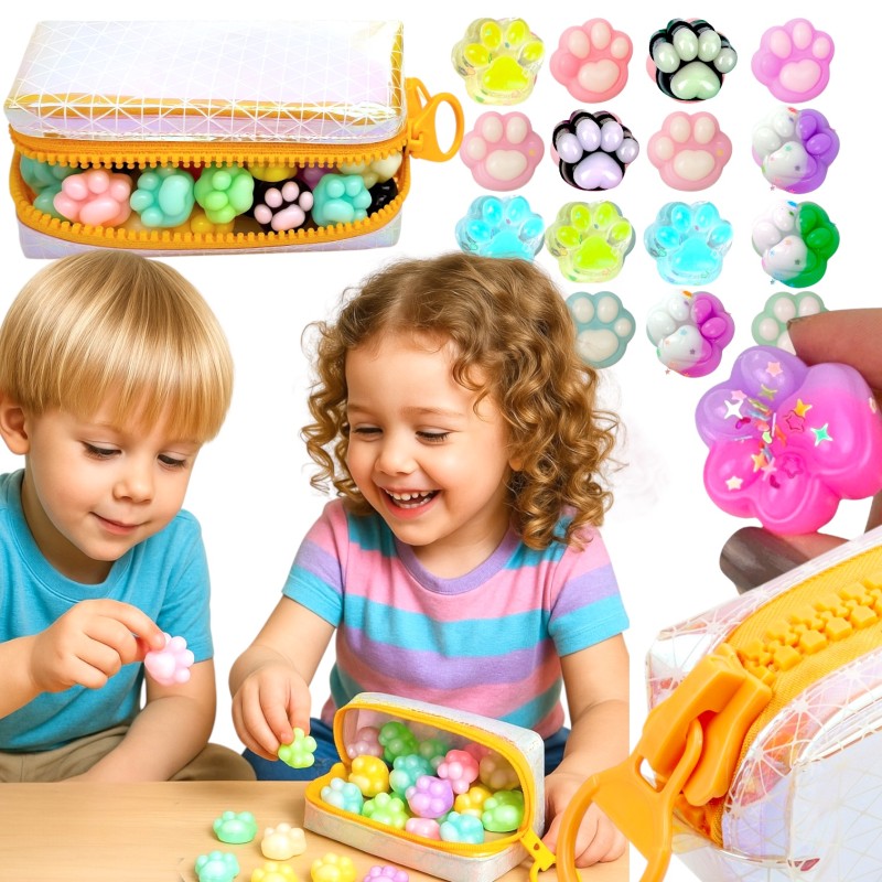 Zestaw prezentowy zawierający 20 uroczych gniotków w kształcie kociej łapki. Idealne do zabawy i redukcji stresu, zapakowane w praktyczną saszetkę. Kolorowe i miękkie, zachwycą każde dziecko.
