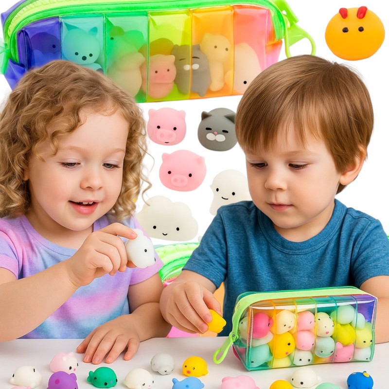 Zestaw 20 mięciutkich gniotków Mochi w kolorowej saszetce. Idealne do zabawy sensorycznej i relaksu. Wesołe wzory milutkich przyjaciół zapewniają radość i odprężenie.