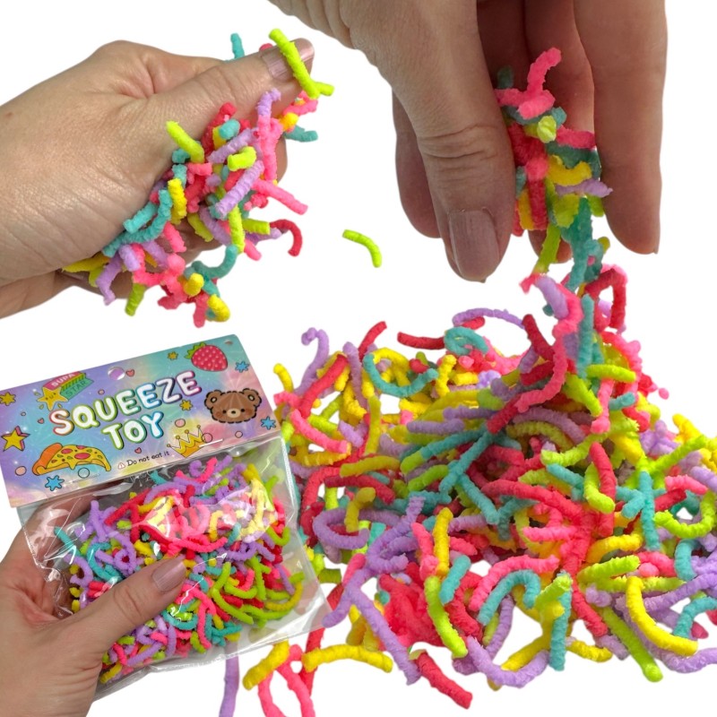 Kolorowe, miękkie i puszyste robaczki sensoryczne do zabaw manualnych. Idealne do ćwiczenia motoryki małej, relaksu i kreatywnej zabawy. Neonowe kolory.