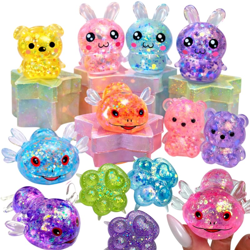 Zestaw 12 błyszczących gniotków z maltozą: misie, króliki, łapki i aksolotle. Każdy ok. 6 cm, osobno zapakowany. Idealne jako drobne prezenty, nagrody i sensoryczne zabawki antystresowe.