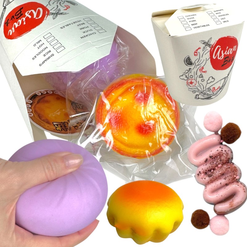 Ten produkt to 1 komplet gniotków w pudełku prezentowym w stylu Asian Box. W środku znajdują się różne miękkie gniotki o kształtach inspirowanych azjatyckim jedzeniem: pierożek, ciastko, babeczka i inne słodkie dodatki. Elementy mają intensywne, apetyczne kolory – od pastelowego fioletu, przez róż, po soczystą żółć i pomarańcz.